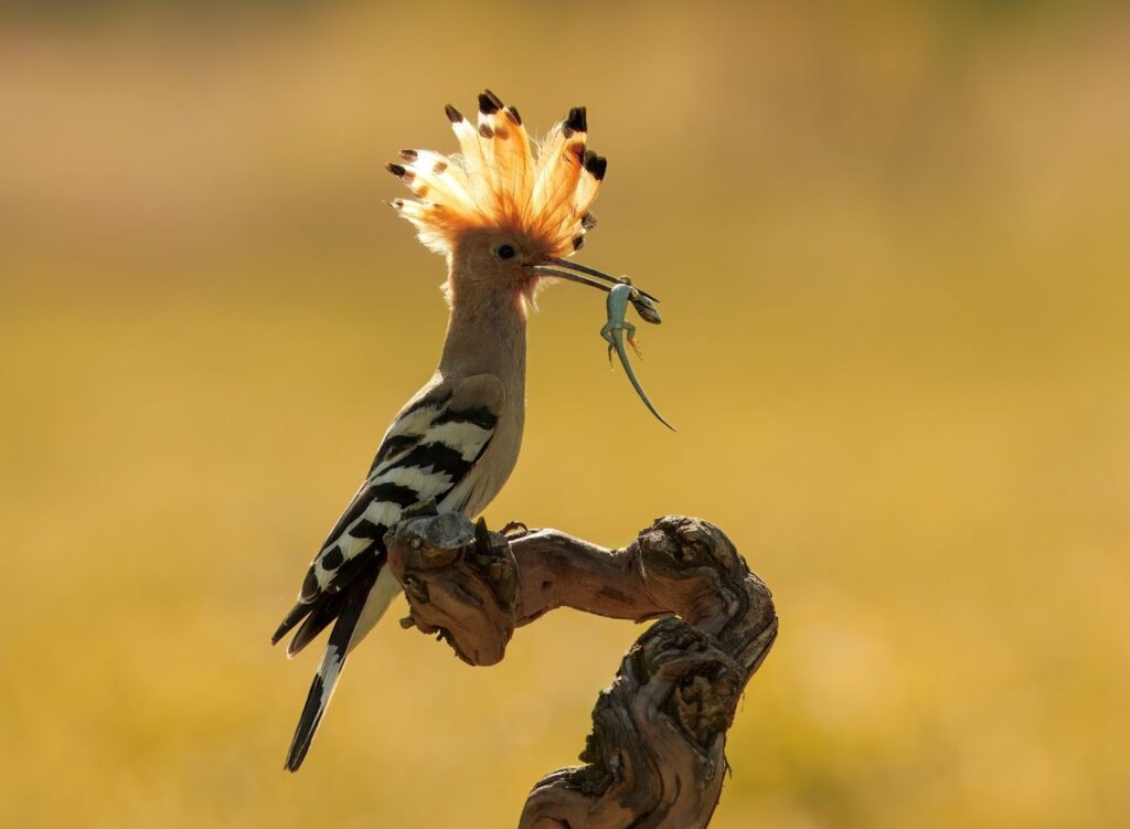 The next image showcases a very rare moment when a Great Crested Hoopoe (Upupa epops) flew in with a caught lizard for a female that was sitting on eggs. Photographed in the Pálava Protected Landscape Area, Czech Republic.