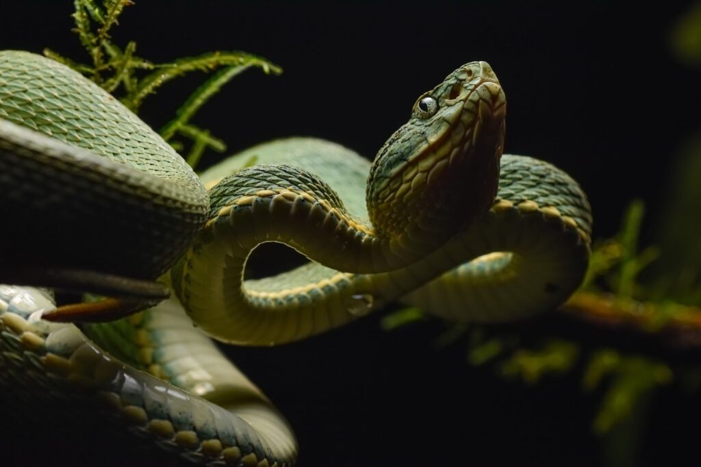 “The image is striking! The green snake with yellow accents is posed dramatically, coiled and looking upwards with its head raised. The lighting highlights the snake’s scales and creates a dynamic contrast against the dark background.” — Jhuma Datta.