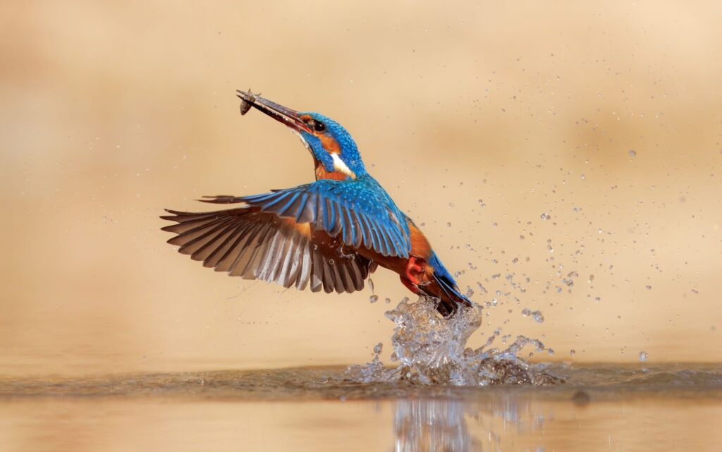 A well-timed moment of a common kingfisher (Alcedo atthis) hunting on a pond was captured in Poodří Protected Landscape Area, Czech Republic.