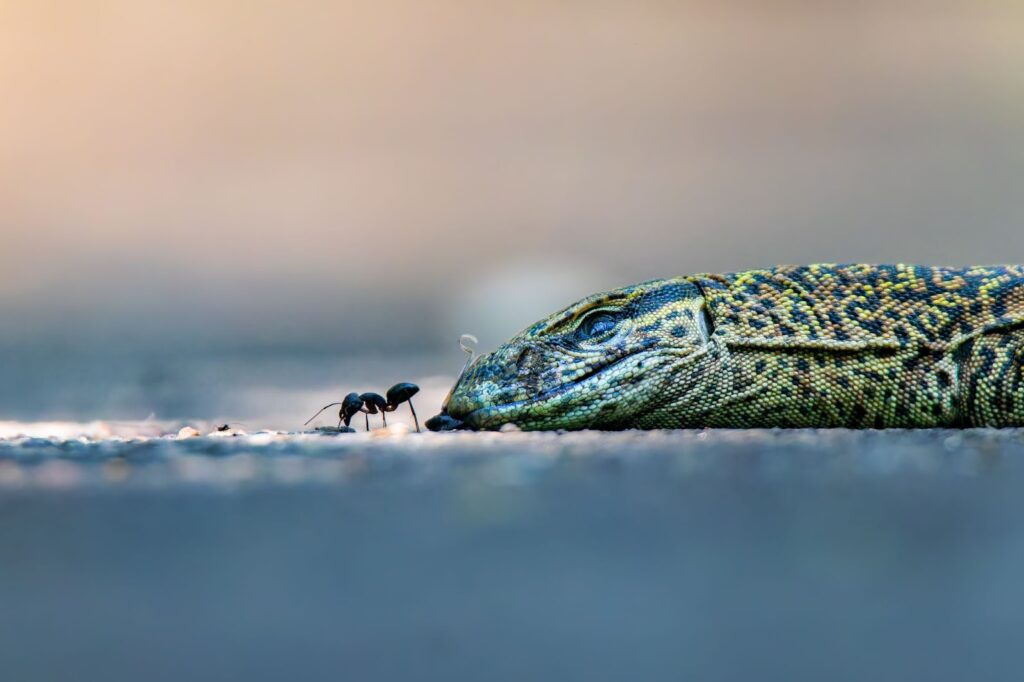 This photograph was taken in the National Botanical Garden of Bangladesh. A black carpenter ant (Camponotus compressus) was tearing flesh from the carcass of a Bengal monitor (Varanus bengalensis). As the life of the monitor ends, the small ant struggles to survive by feeding on it. This is a remarkable example of nature’s food chain.