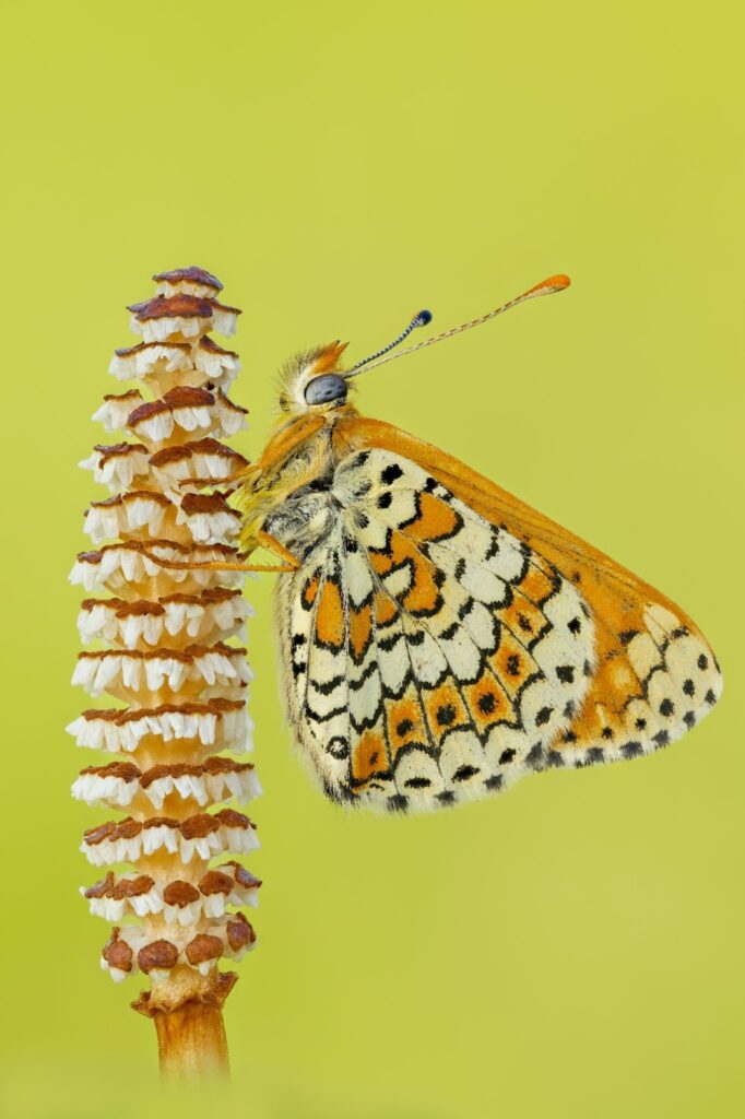 The next macro shot depicts Glanville Fritillary (Melitaea cinxia) in the Wittenberge-Rühstädter Elbniederung Nature Reserve in Germany.